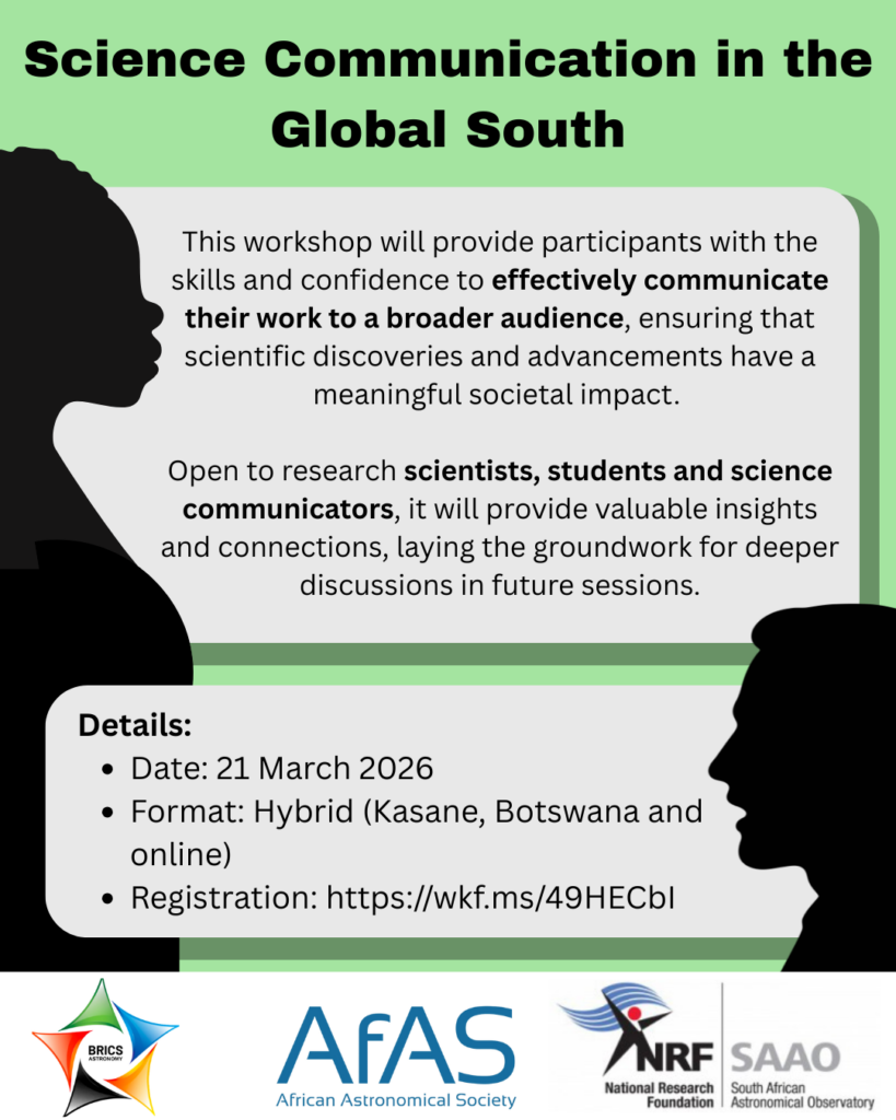 Join us at the AfAS conference for the SciComm training. This program is designed to equip researchers, students, professionals, and science communicators in astronomy and other basic sciences across BRICS and African countries with essential skills